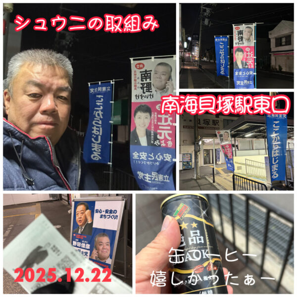 人権が尊重されたまちをめざす貝塚市議会議員の南野けいすけです。 12月22日は、シュウニの取組みから始めました。 今週は水曜日が終業式で見守り隊に行くので、それ以外はどこかの駅に立ちます。 今週末で仕事納めの方も多いと思 […]