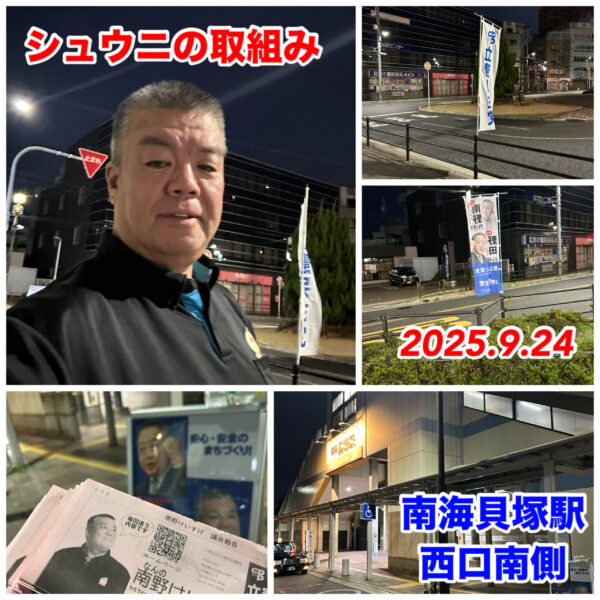 住居表示を進める貝塚市議会議員の南野けいすけです。 9月9日は、シュウニの取組みからスタートしました。 南海貝塚駅東口で行いました。 議会報告ニュースNo.84を新たに作成しお配りしました。 沢山の皆さんに受け取っていた […]