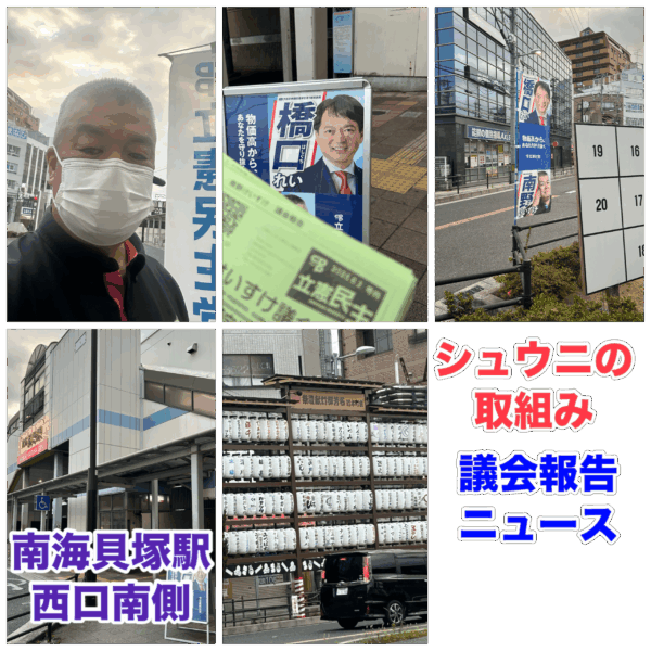 安心して働ける環境づくりをめざす貝塚市議会議員の南野けいすけです。 今朝(6月12日)は、シュウニの取組みからスタートです。 南海二色浜駅で行いました。 二色浜駅前道路拡幅工事もかなり進んでますね。 あと少しです。 今日 […]