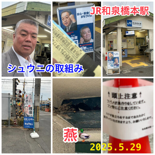 住居表示を進める貝塚市議会議員の南野けいすけです。 今朝(5月29日)は、シュウニの取組みからスタートしました。 JR和泉橋本駅で行いました。 駅舎に燕の巣が以前から出来ていました。 餌をあげてるのかなぁー 駅員さんの心 […]