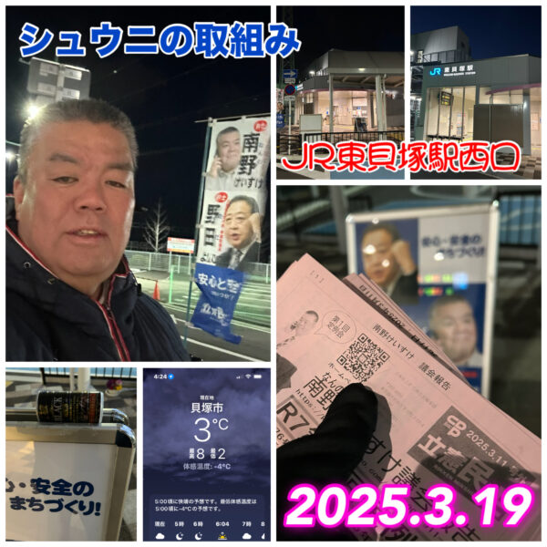 子ども達が安心して学べる環境をつくる貝塚市議会議員の南野けいすけです。 今朝(3月19日)は、シュウニの取組みからスタート。 JR東貝塚駅西口で行いました。 起床時の気温が3℃で体感温度が−4℃ スタート時の気温2℃と無 […]