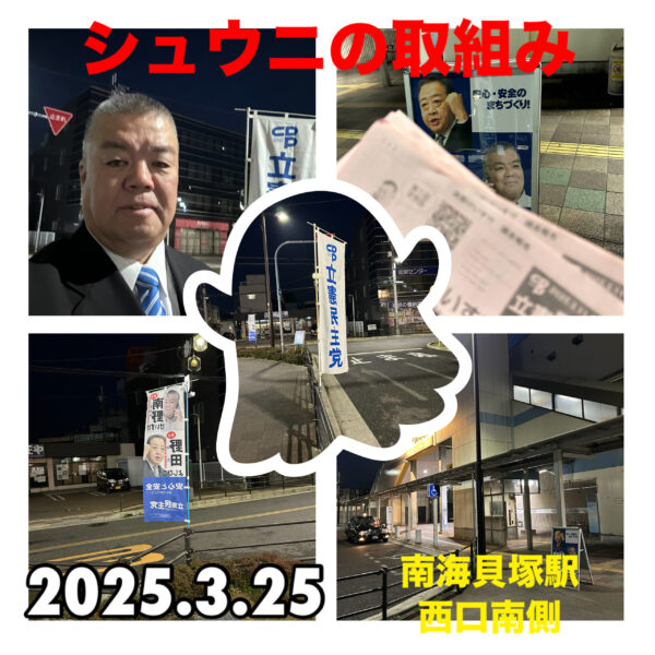 ジェンダー平等をめざす貝塚市議会議員の南野けいすけです。 今朝(3月25日)は、シュウニの取組みを南海貝塚駅西口南側で行いました。 久しぶりに上着無しで取り組めました。 春ですねー。春休み。お出かけする子ども達も多かった […]
