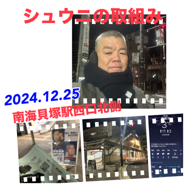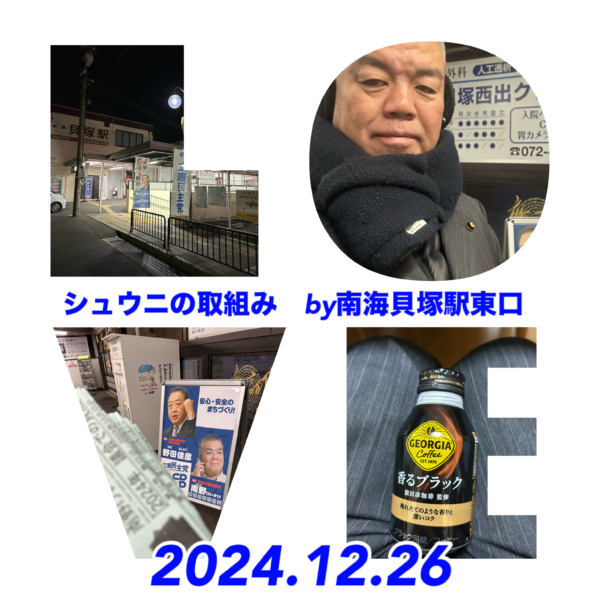 今朝(12月25日)は、シュウニの取組みからスタートしました。 南海貝塚駅西口北側で行いました。 起床時の気温は3℃ 本当に冷たい朝です。 新たに議会報告ニュースNo.72号を作成し、お配りしました。 2024年に行った […]