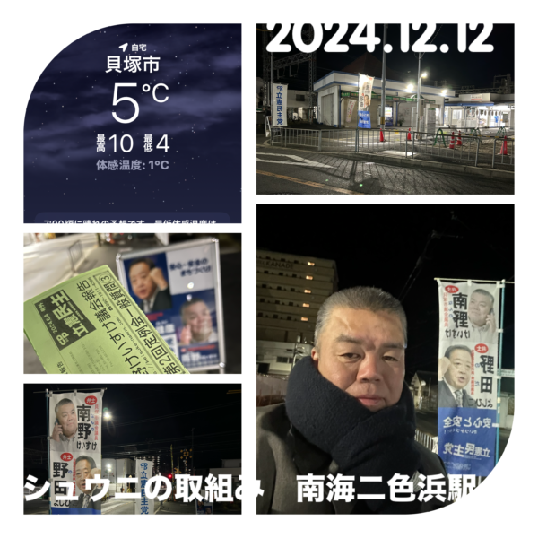 今朝(12月12日)は、シュウニの取組みからスタート 南海二色浜駅で行いました。 起床時の気温が5℃ 体感温度が1℃ 指先がかじかんで大変でした。 そんな中でも沢山の皆さんに議会報告ニュースを受け取っていただけました。 […]