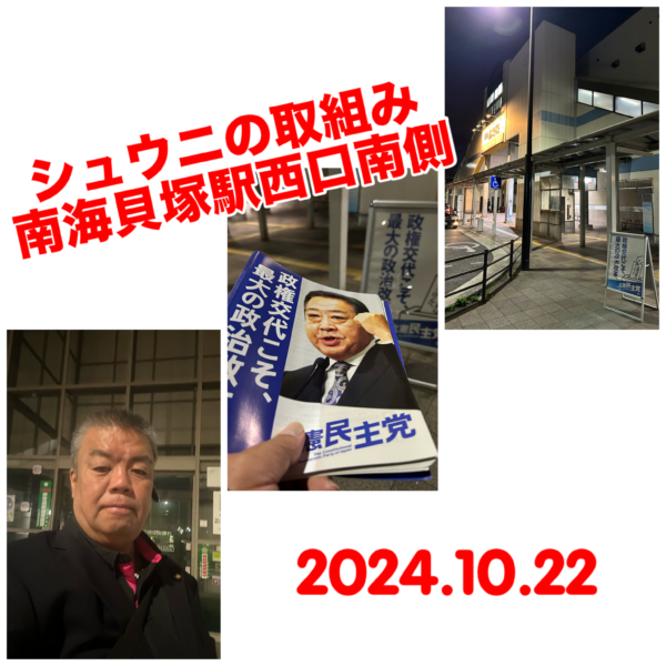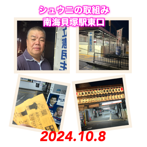 今朝もシュウニの取組みからスタートしました。 南海貝塚駅西口南側で行いました。 「立憲がんばらなあんよー」のお声かけも頂き嬉しくなりました。 色々質問等もいただけました。 しっかりと答えられたとは思ってます。 今日も1日 […]