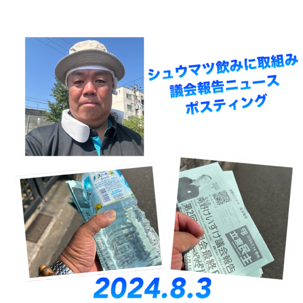 今朝(8月8日)は、シュウニの取組みからスタート JR東貝塚駅東口で取組みました。 日陰では結構涼しく感じましたが、最後30分は日が照って暑くて暑くて 水分しっかり取りながら取組みました。 今日も沢山の方に議会報告ニュー […]