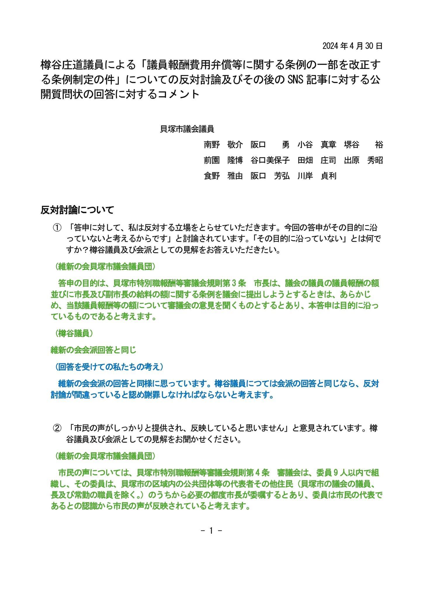 維新の会回答に対するコメント ↑ PDFファイルはこちらから 樽谷庄道議員及び維新の会貝塚市議会議員団への公開質問状の回答に対する11名の議員のコメントがまとまりました。 詳しくは添付の資料をご覧ください。 […]