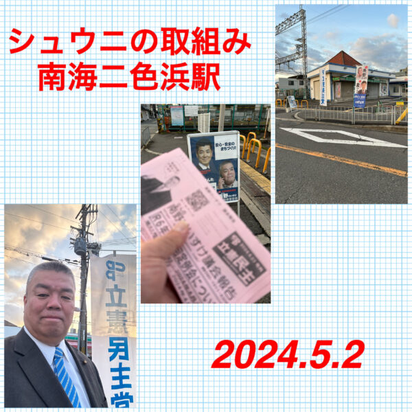 今日は南海二色浜駅でシュウニの取組みからスタート GWの影響で三日連続の取り組みとなりました。 少し肌寒い朝です。 体調の管理が難しいですね。 そんな中でも沢山の人に議会報告ニュースを受け取っていただけました。 感謝しか […]