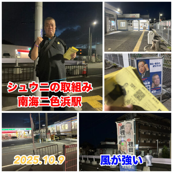 環境を大切にする貝塚市議会議員の南野けいすけです。 10月9日は、シュウニの取組みからスタート。 南海二色浜駅にて取組みました。 台風の影響か、風が強かったです。 台風の被害が少ないことを祈るばかりです。 そんな中でも議 […]